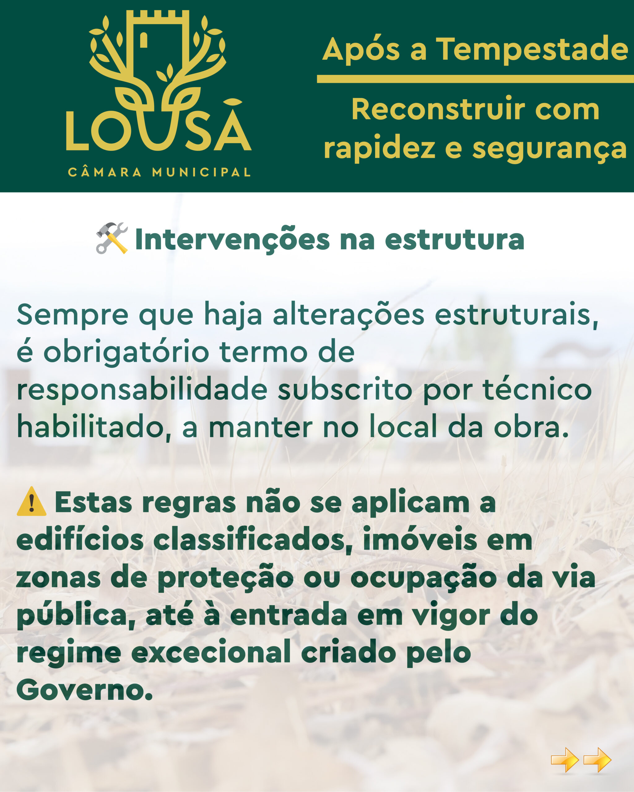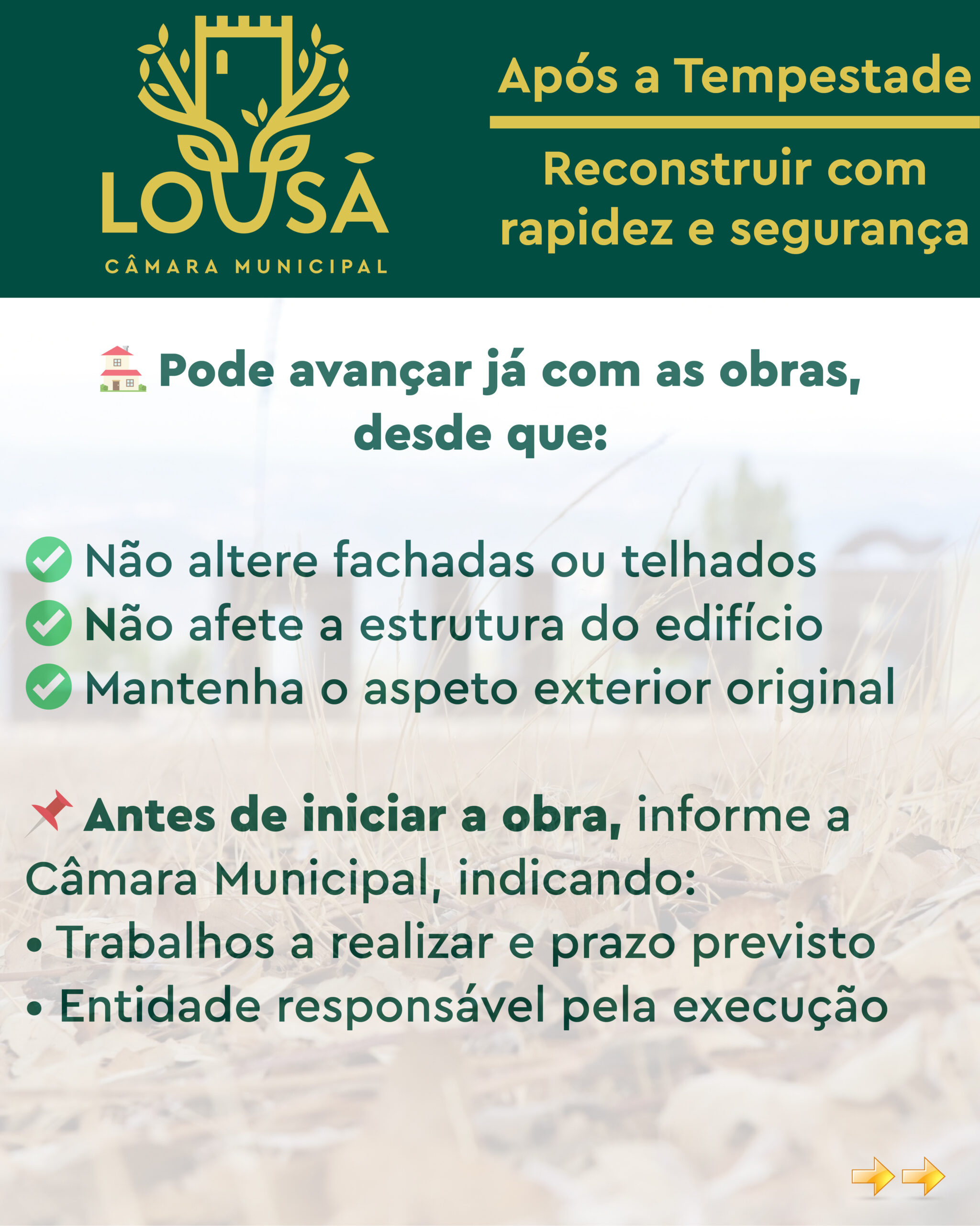 Na sequência dos danos provocados pelas recentes condições meteorológicas adversas que afetaram o concelho da Lousã, a Câmara Municipal informa que estão criadas condições para agilizar os processos de reparação e reconstrução de edifícios danificados, garantindo simultaneamente rapidez de intervenção e segurança estrutural.
