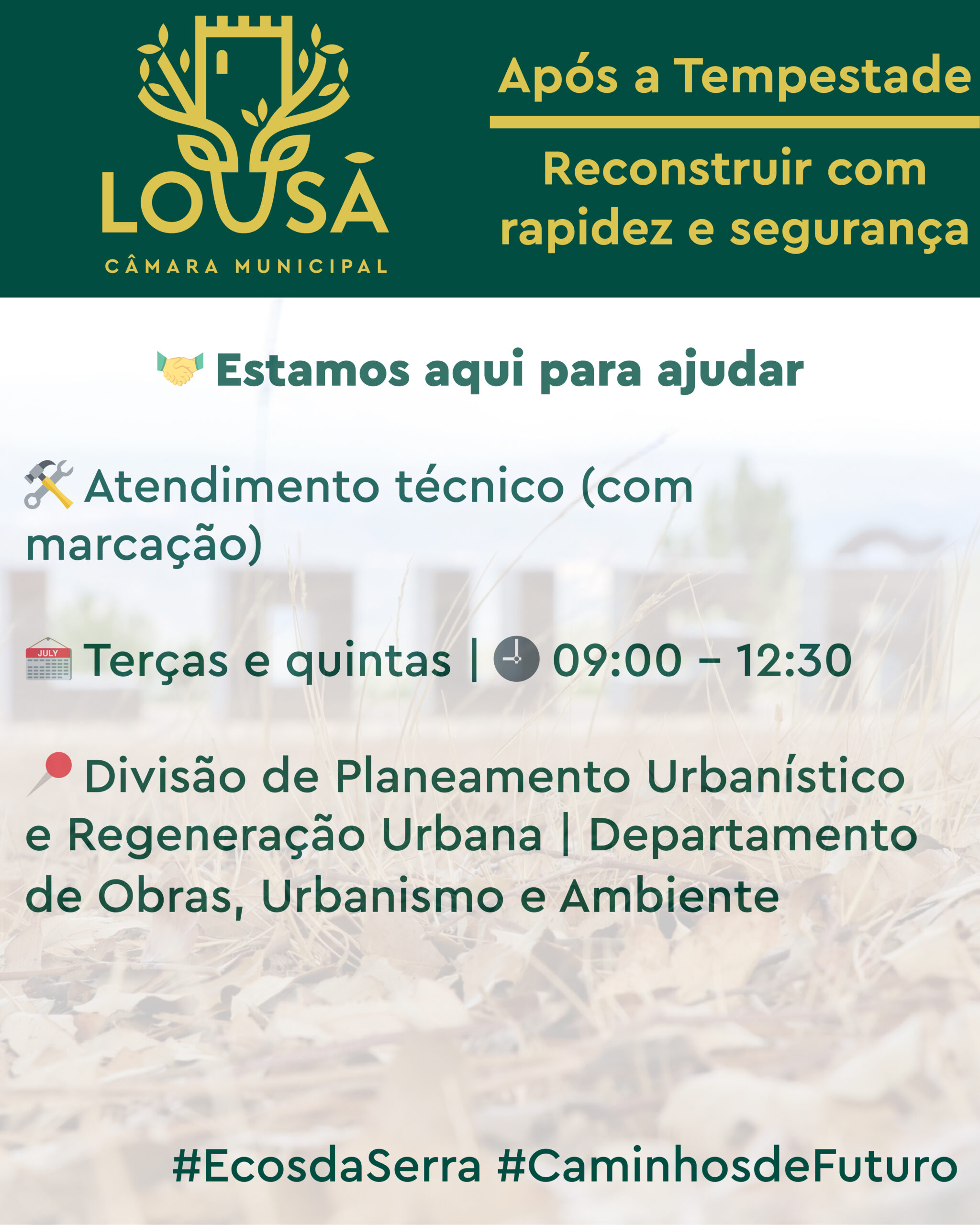 A Câmara Municipal da Lousã continuará a desenvolver todas as diligências necessárias para apoiar a população, as empresas e as instituições do concelho, reafirmando o compromisso de reconstruir com segurança, proximidade e confiança.