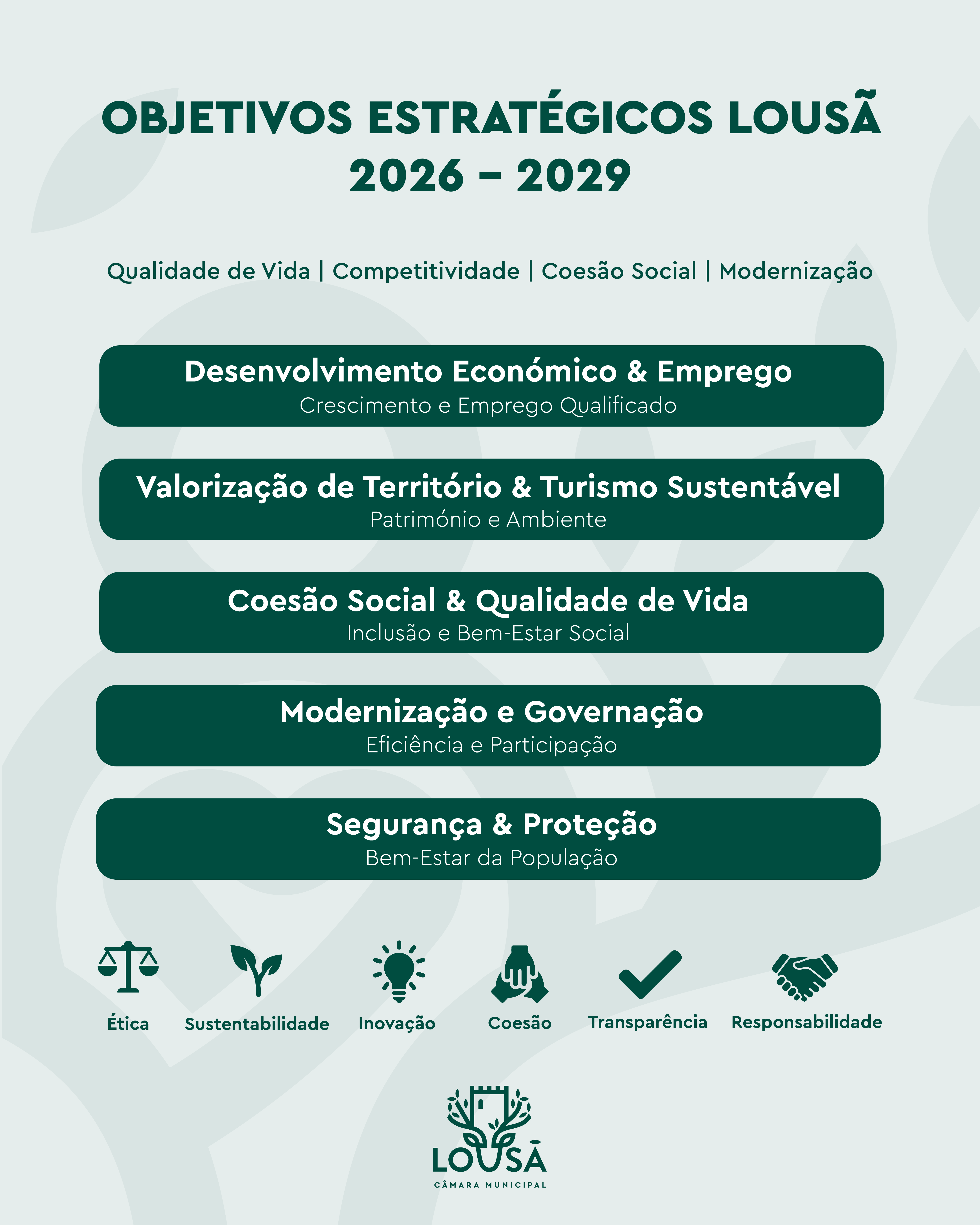 O documento aprovado enquadra-se numa estratégia global clara e coerente, assente em valores como a ética, a responsabilidade, a competitividade, a coesão territorial, a equidade, a inovação, a sustentabilidade ambiental, a transparência, a cultura de melhoria contínua e a orientação para o cidadão. Estes princípios assumem-se como base da ação municipal e da definição das políticas públicas a desenvolver ao longo do ciclo 2026-2029.